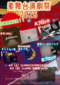 ゆっくん一座の次なる舞台はなんと、酢豚?・・・イ~ッ?じゃなくて、素舞台(すぶたい)!です。何にもないうどんが素うどんなら、何にもない舞台が素舞台。大道具は本当に何にもなし。小道具は演者ひとりにつきひとつまで!という規定なので、楽器がないと何もできないマサオカは、どうにか小道具と認めてもらった楽器を携え、そしてそのマサオカのチェロって楽器は座って弾くもの。椅子が要る!それをゆっくんさんが持ち込んでそれで終わり!そんな、何にもない素舞台でゆっくん一座が演じるのは、ゆっくん一座の単独ライブ春バージョン!単独じゃないだろ?って、いやその、演目のタイトルが!・・・ということで、素舞台演劇祭2026、ゆっくん一座はBブロックに登場します。よろしければ!